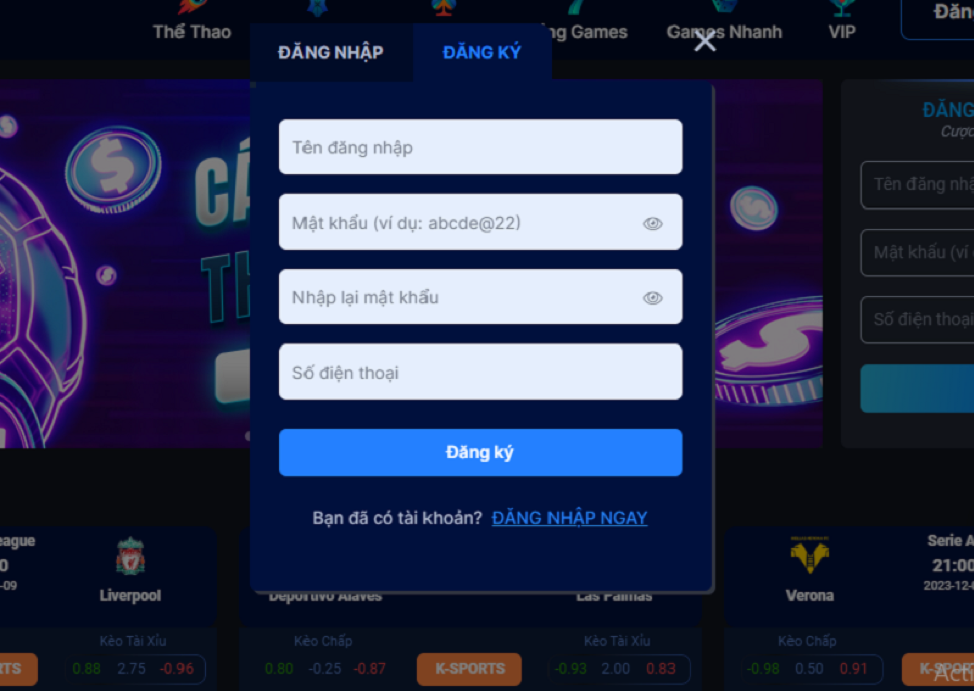 Giao diện đăng ký tài khoản để anh em điền thông tin